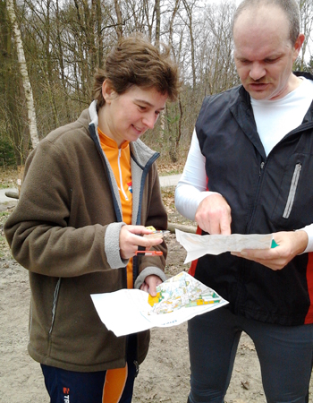 Vroeg het bed uit op zondag, want om 10 uur starten we. Er is een gemengd gezelschap aanwezig (jong en jong geweest / snelle en nog snellere). De groep splitst zich op; de jongste gaan met Ton mee en de rest volgt Clemens. Allereerst vertrekken we met een ‘blanco’ OL-kaart (kaart zonder posten), we moeten bijhouden waar we zijn op de kaart. Lijkt een makkie, maar algauw duikt Clemens het bos in, heuvel op en af, steken een klein paadje over, een sloot en weer het bos in … ‘wijs maar aan waar we zijn’. Dat hadden we volgens mij allemaal goed, maar hij had mij het geen 150m eerder moeten vragen. We vervolgen onze tocht en zo oefenen we een aantal keer. Daarna mogen de allersnelsten nog een extra oefening doen en gaat de rest beginnen aan een 3tal korte omloopjes. Doel: doorsteken en je focussen op de belangrijkste zaken op de aart/terrein en proberen te zien waar je heen moet naar de volgende post. De ene post ging beter dan de andere, al die ‘kriebel’ heuveltjes en dalen dat vindik toch moeilijk. Ook op weg naar een post me vast gelopen in gekapt gebied met dennetjes. Toen volledig van koers geraakt en hierdoor teveel meters gemaakt en tijd verloren. De overige posten gaan prima en ook het vooraf bekijken naar de volgende post.